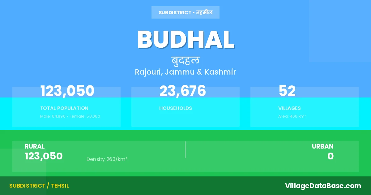 According to the 2011 census The total area of Budhal Tehsil is 468 km², with a population of 123050 people. The population density is 263 inhabitants per square kilometre, and there are approximately 23676 houses in the sub district.