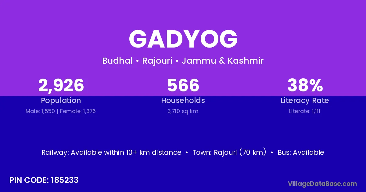 Rajouri (70 km) is the nearest town to Gadyog village for major economic activities and is located approximately 70 km away.