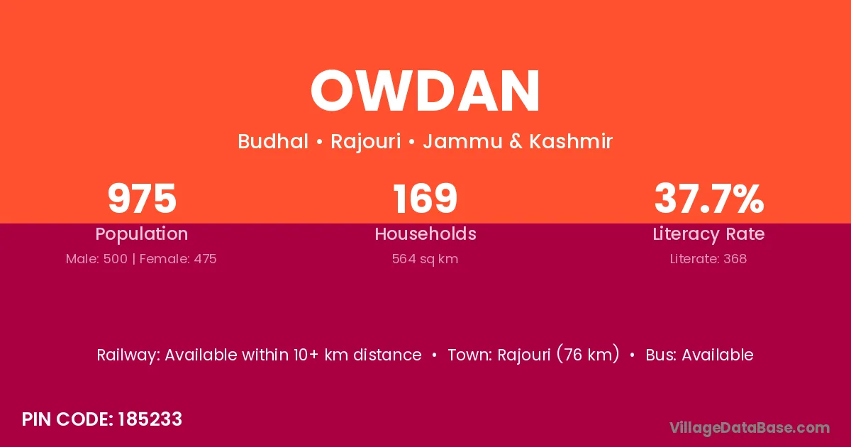 Rajouri (76 km) is the nearest town to Owdan village for major economic activities and is located approximately 76 km away.