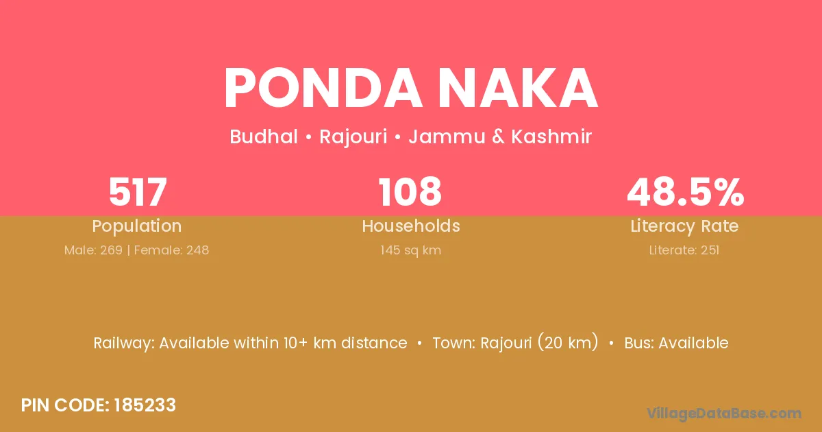 Rajouri (20 km) is the nearest town to Ponda Naka village for major economic activities and is located approximately 20 km away.
