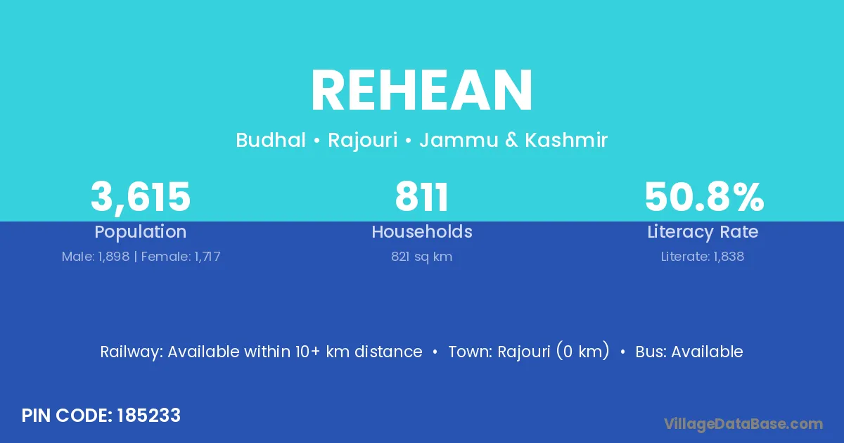 Rajouri (0 km) is the nearest town to Rehean village for major economic activities