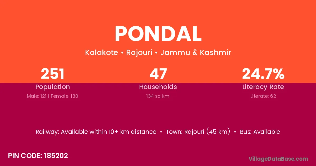 Rajouri (45 km) is the nearest town to Pondal village for major economic activities and is located approximately 45 km away.