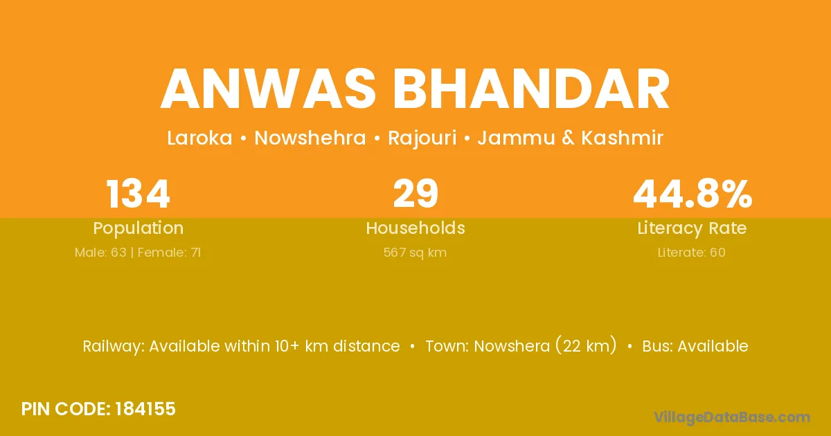 Anwas Bhandar village has a total population of 134 people, of which 63 are males and 71 are females.