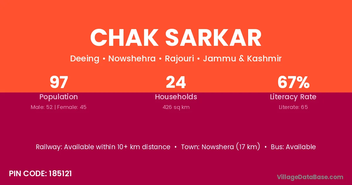Chak Sarkar village has a total population of 97 people, of which 52 are males and 45 are females.