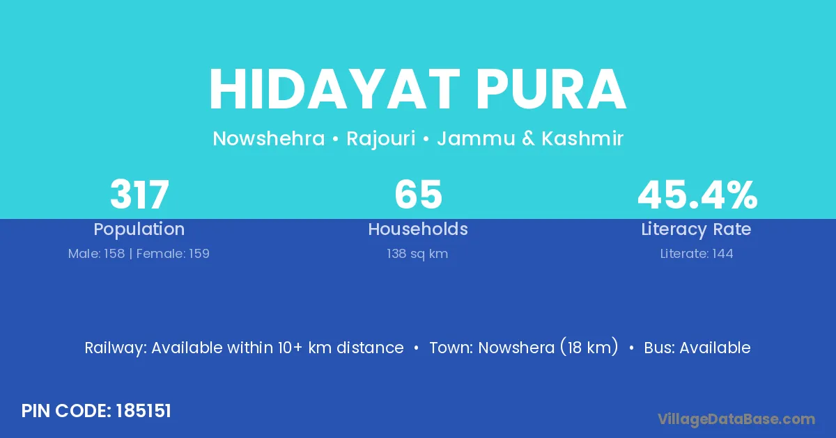 Nowshera (18 km) is the nearest town to Hidayat Pura village for major economic activities and is located approximately 18 km away.