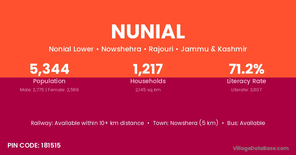 Nowshera (5 km) is the nearest town to Nunial village for major economic activities and is located approximately 5 km away.