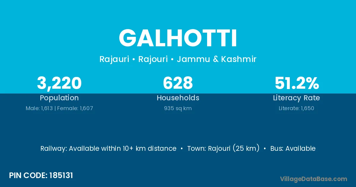 Rajouri (25 km) is the nearest town to Galhotti village for major economic activities and is located approximately 25 km away.