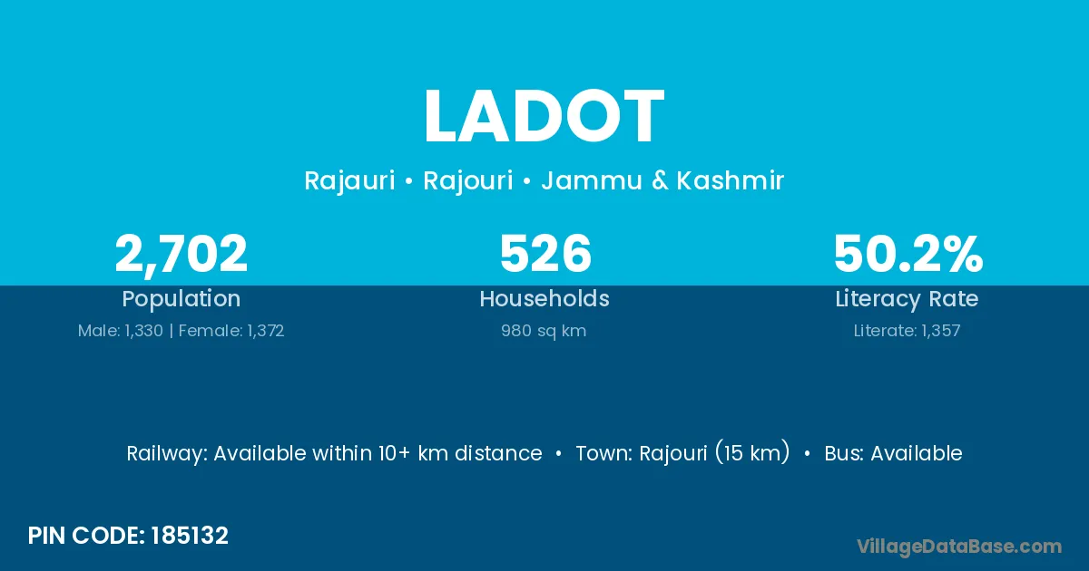 Rajouri (15 km) is the nearest town to Ladot village for major economic activities and is located approximately 15 km away.