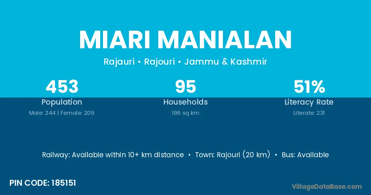 Rajouri (20 km) is the nearest town to Miari Manialan village for major economic activities and is located approximately 20 km away.