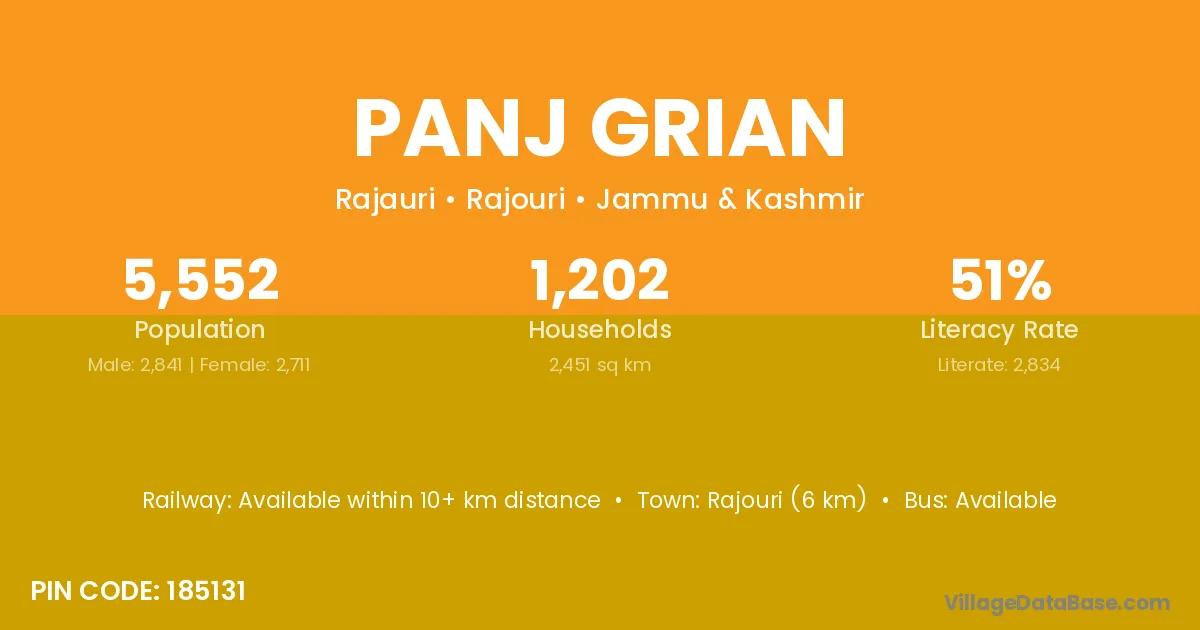 Rajouri (6 km) is the nearest town to Panj Grian village for major economic activities and is located approximately 6 km away.