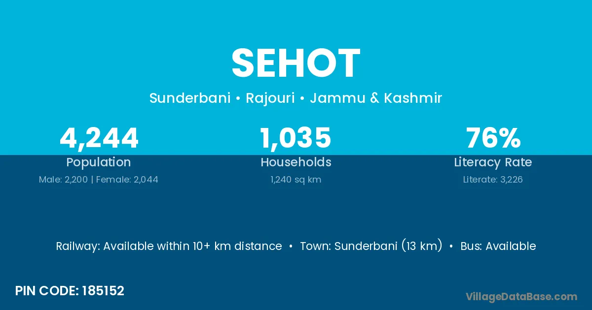 Sunderbani (13 km) is the nearest town to Sehot village for major economic activities and is located approximately 13 km away.