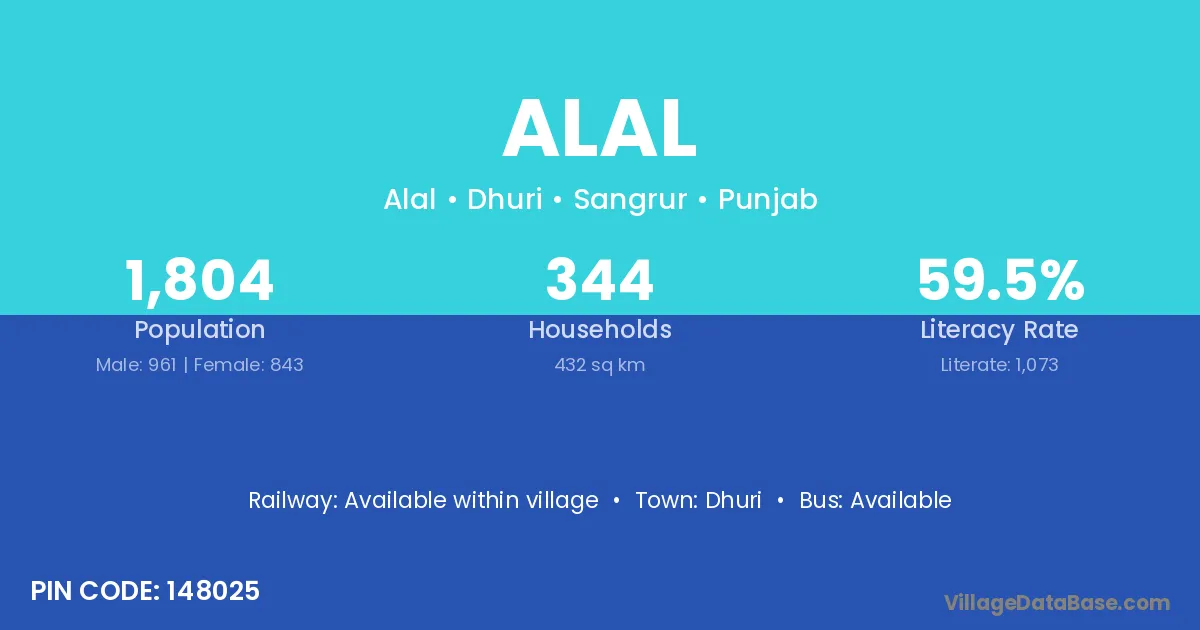 The literacy rate of Alal village is 45.52%. Male literacy stands at 56.65% and female literacy at 33.27%.