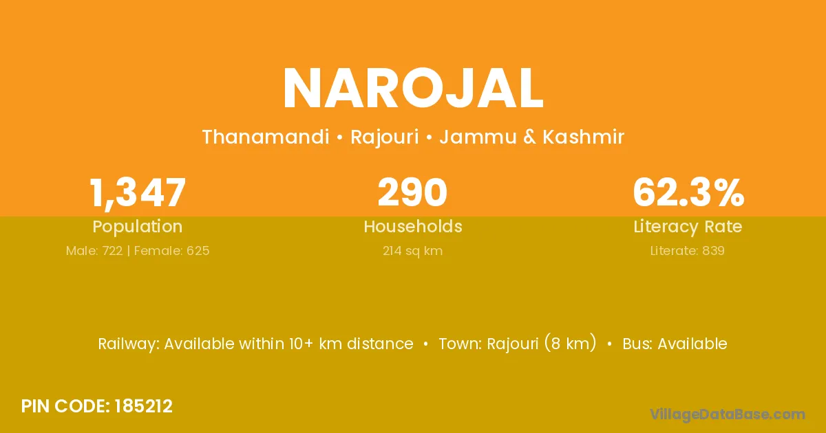 Rajouri (8 km) is the nearest town to Narojal village for major economic activities and is located approximately 8 km away.