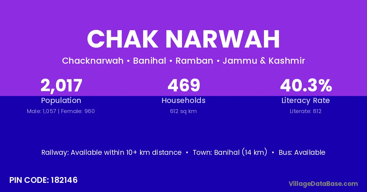 Banihal (14 km) is the nearest town to Chak Narwah village for major economic activities and is located approximately 14 km away.
