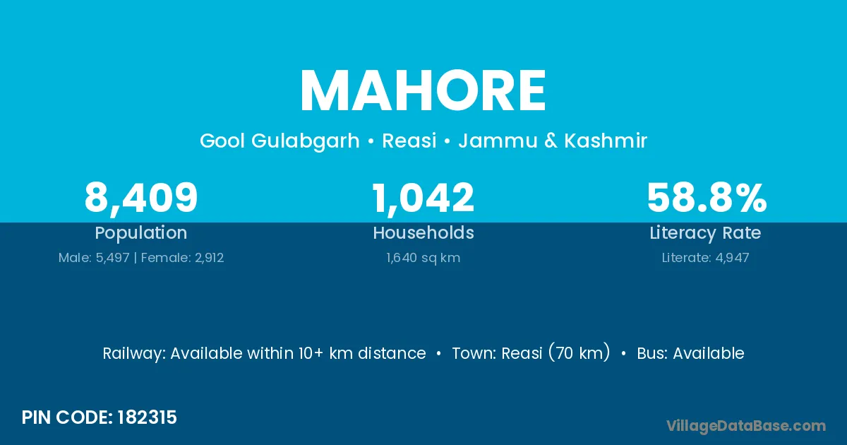Reasi (70 km) is the nearest town to Mahore village for major economic activities and is located approximately 70 km away.