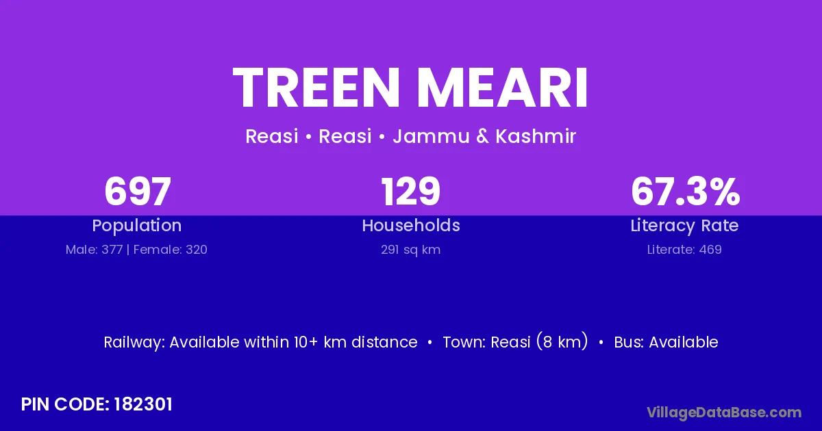 Reasi (8 km) is the nearest town to Treen Meari village for major economic activities and is located approximately 8 km away.