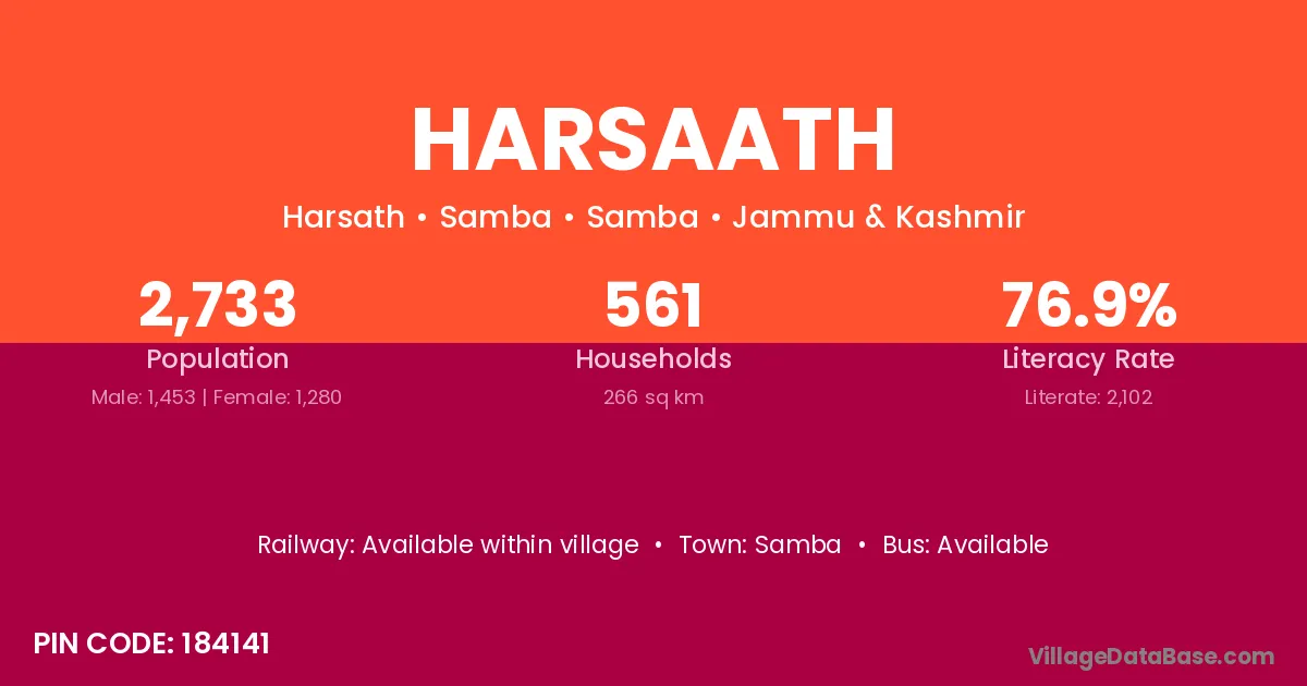 Harsaath village has a total population of 2,733 people, of which 1,453 are males and 1,280 are females.