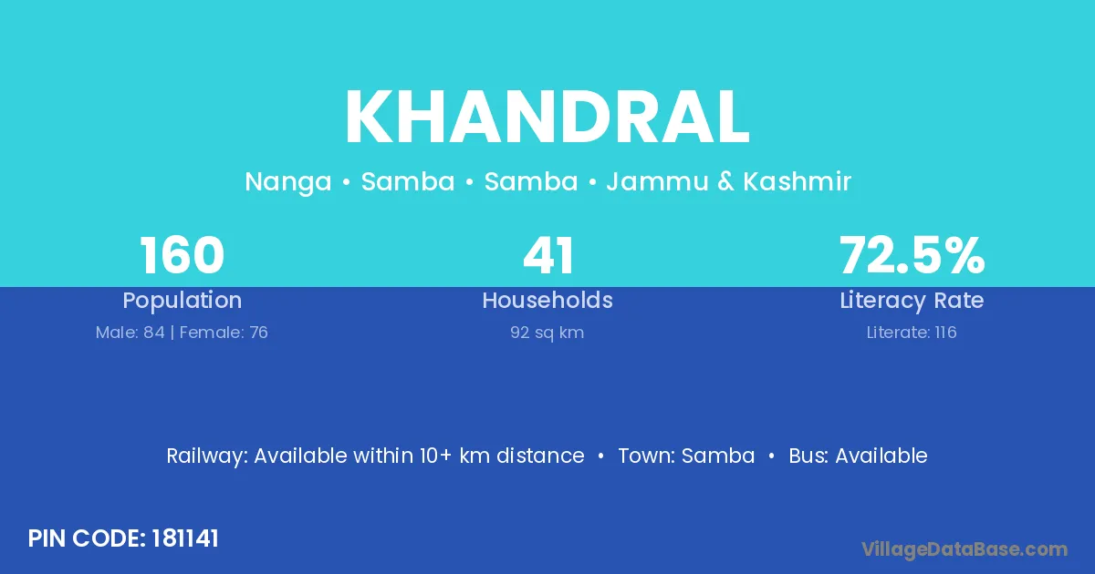 Khandral village has a total population of 160 people, of which 84 are males and 76 are females.