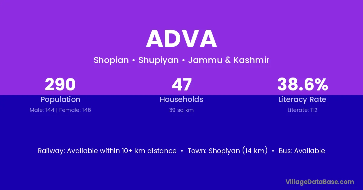 Shopiyan (14 km) is the nearest town to Adva village for major economic activities and is located approximately 14 km away.