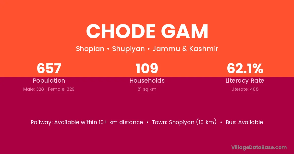Shopiyan (10 km) is the nearest town to Chode Gam village for major economic activities and is located approximately 10 km away.