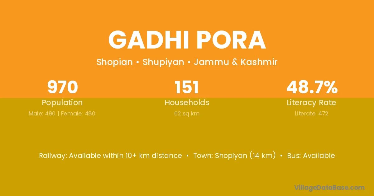 Shopiyan (14 km) is the nearest town to Gadhi Pora village for major economic activities and is located approximately 14 km away.