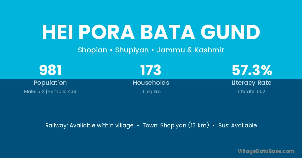 Shopiyan (13 km) is the nearest town to Hei Pora Bata Gund village for major economic activities and is located approximately 13 km away.