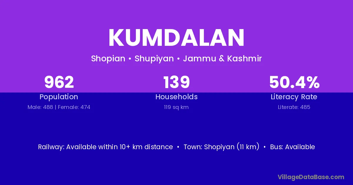 Kumdalan village has a total population of 962 people, of which 488 are males and 474 are females.