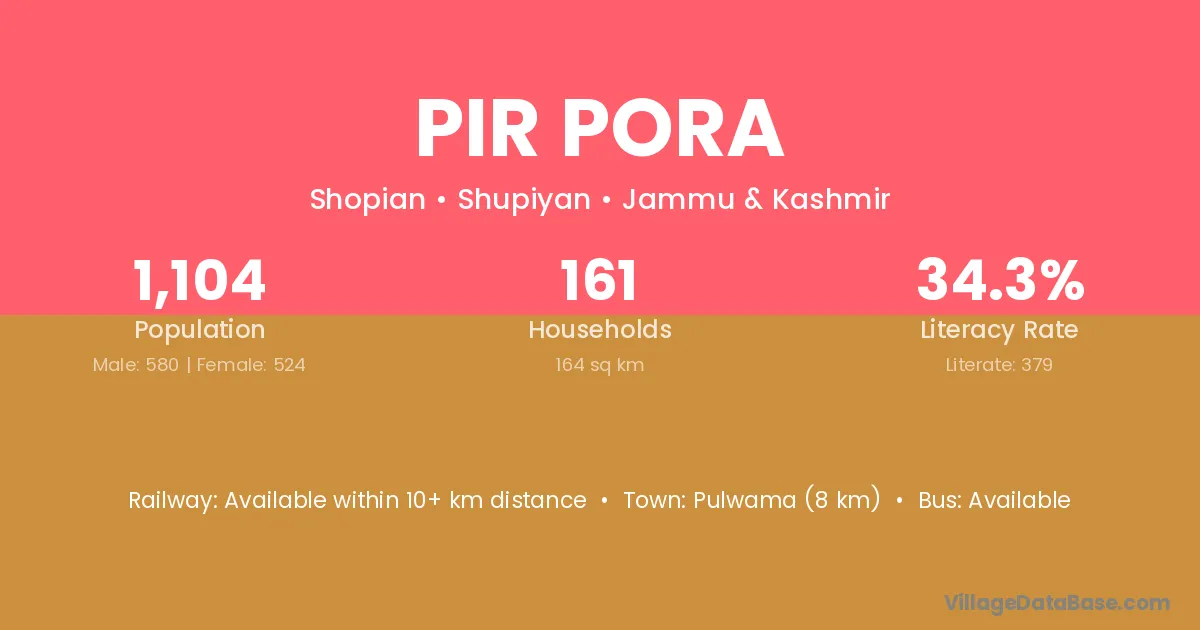 Pulwama (8 km) is the nearest town to Pir Pora village for major economic activities and is located approximately 8 km away.