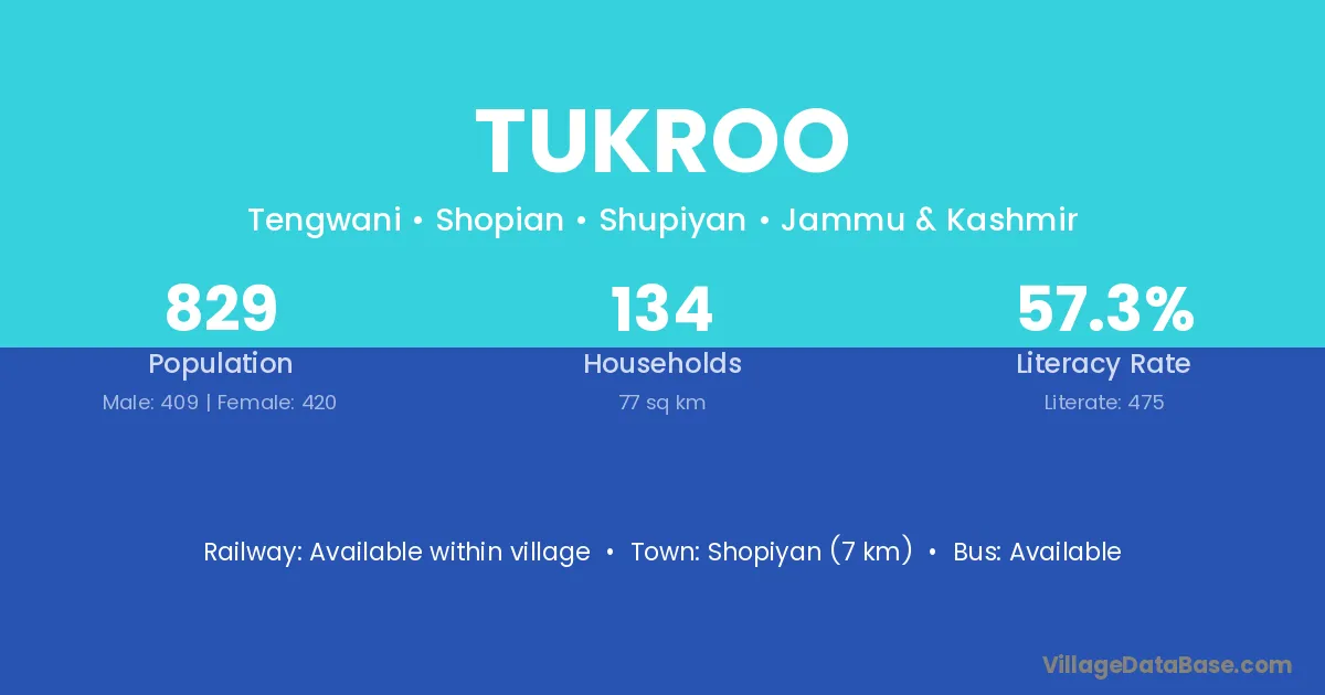 Tukroo village has a total population of 829 people, of which 409 are males and 420 are females.