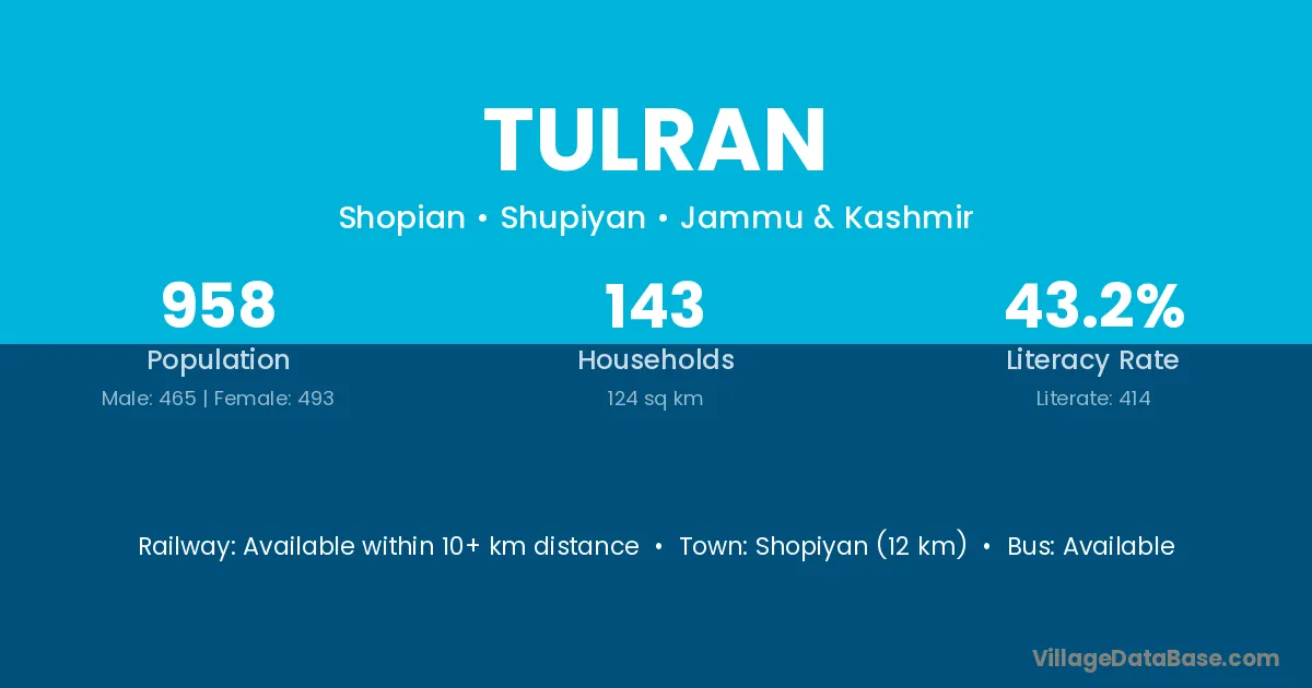 Shopiyan (12 km) is the nearest town to Tulran village for major economic activities and is located approximately 12 km away.