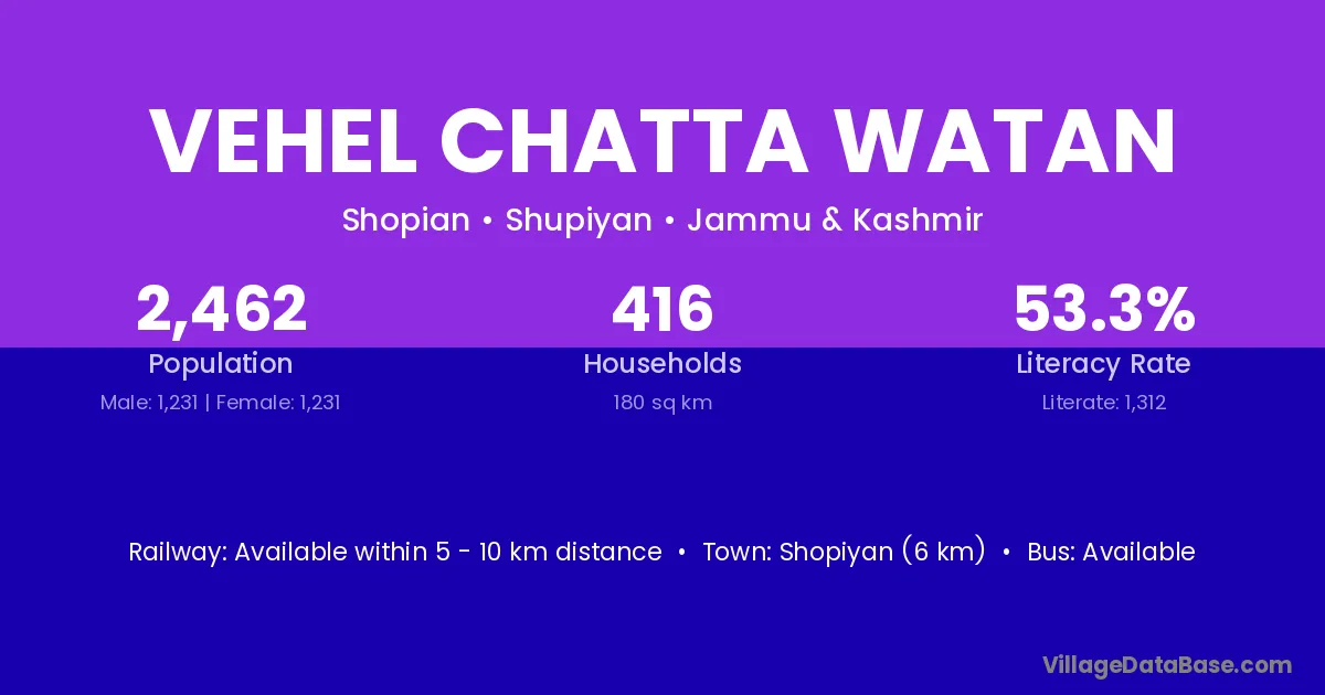 Shopiyan (6 km) is the nearest town to Vehel Chatta Watan village for major economic activities and is located approximately 6 km away.