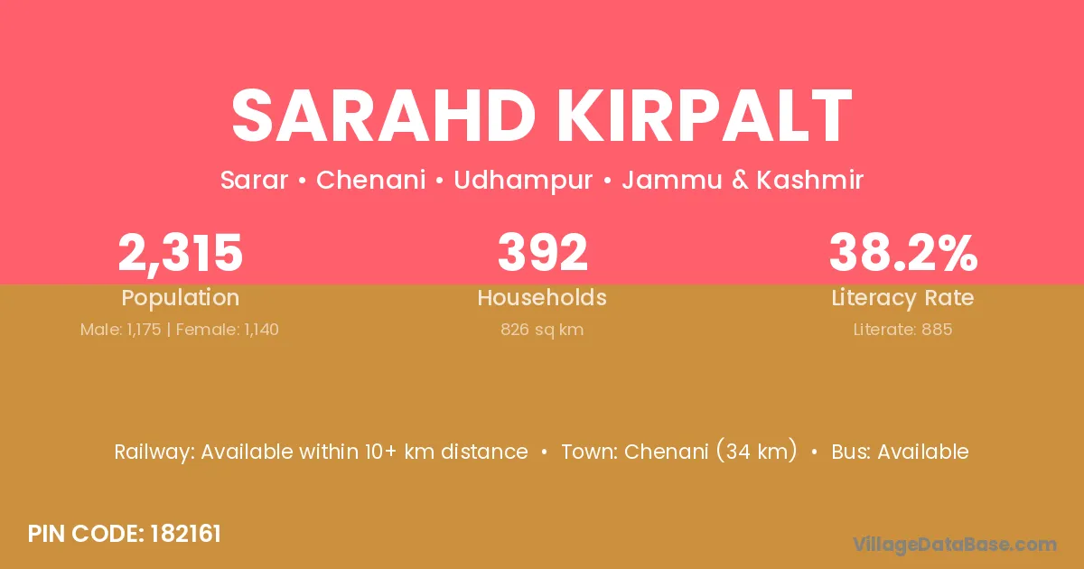 Chenani (34 km) is the nearest town to Sarahd Kirpalt village for major economic activities and is located approximately 34 km away.