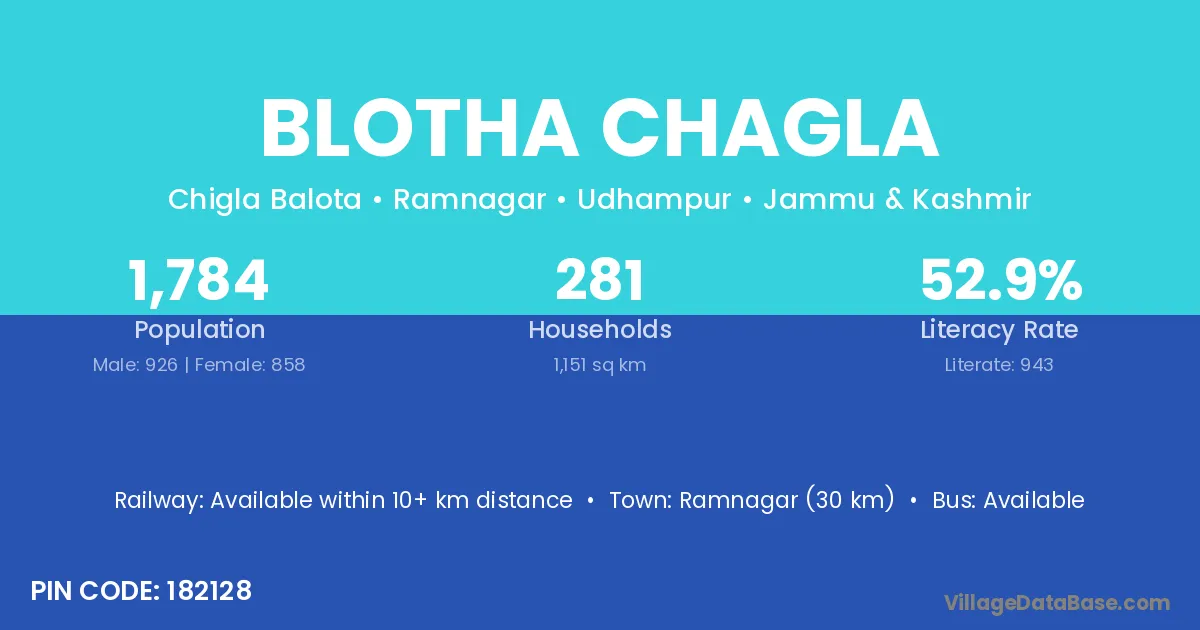 Ramnagar (30 km) is the nearest town to Blotha Chagla village for major economic activities and is located approximately 30 km away.