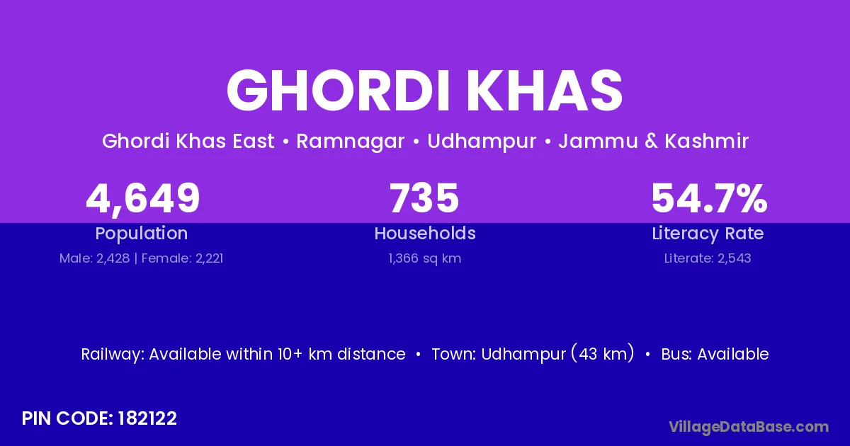 Udhampur (43 km) is the nearest town to Ghordi Khas village for major economic activities and is located approximately 43 km away.
