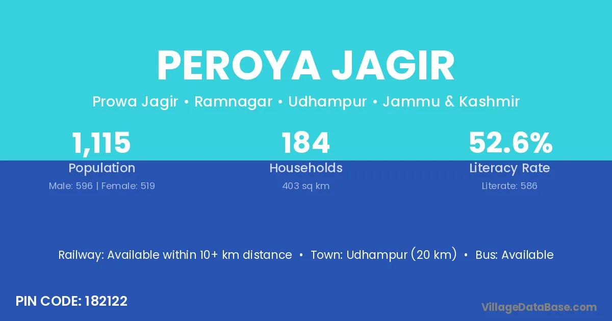 Udhampur (20 km) is the nearest town to Peroya Jagir village for major economic activities and is located approximately 20 km away.