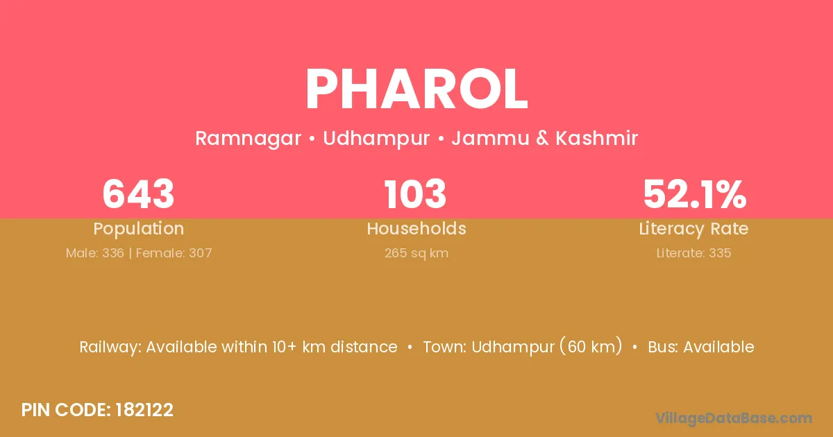 Udhampur (60 km) is the nearest town to Pharol village for major economic activities and is located approximately 60 km away.