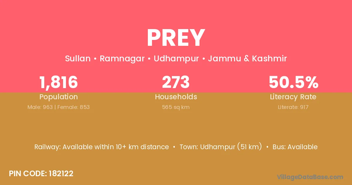Udhampur (51 km) is the nearest town to Prey village for major economic activities and is located approximately 51 km away.