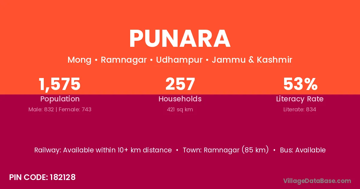Ramnagar (85 km) is the nearest town to Punara village for major economic activities and is located approximately 85 km away.