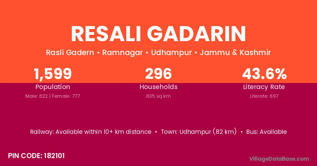 Udhampur (82 km) is the nearest town to Resali Gadarin village for major economic activities and is located approximately 82 km away.