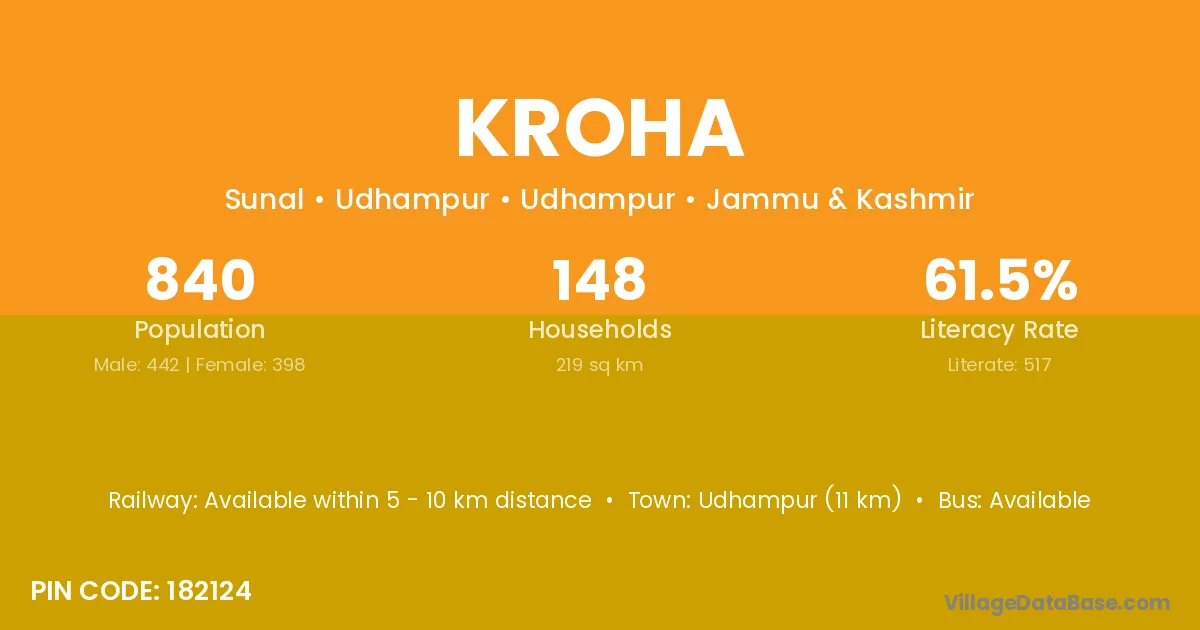 Udhampur (11 km) is the nearest town to Kroha village for major economic activities and is located approximately 11 km away.