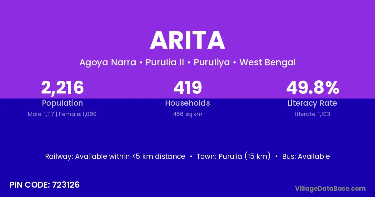 The literacy rate of Arita village is 46.28%. Male literacy stands at 58.09% and female literacy at 34.42%.