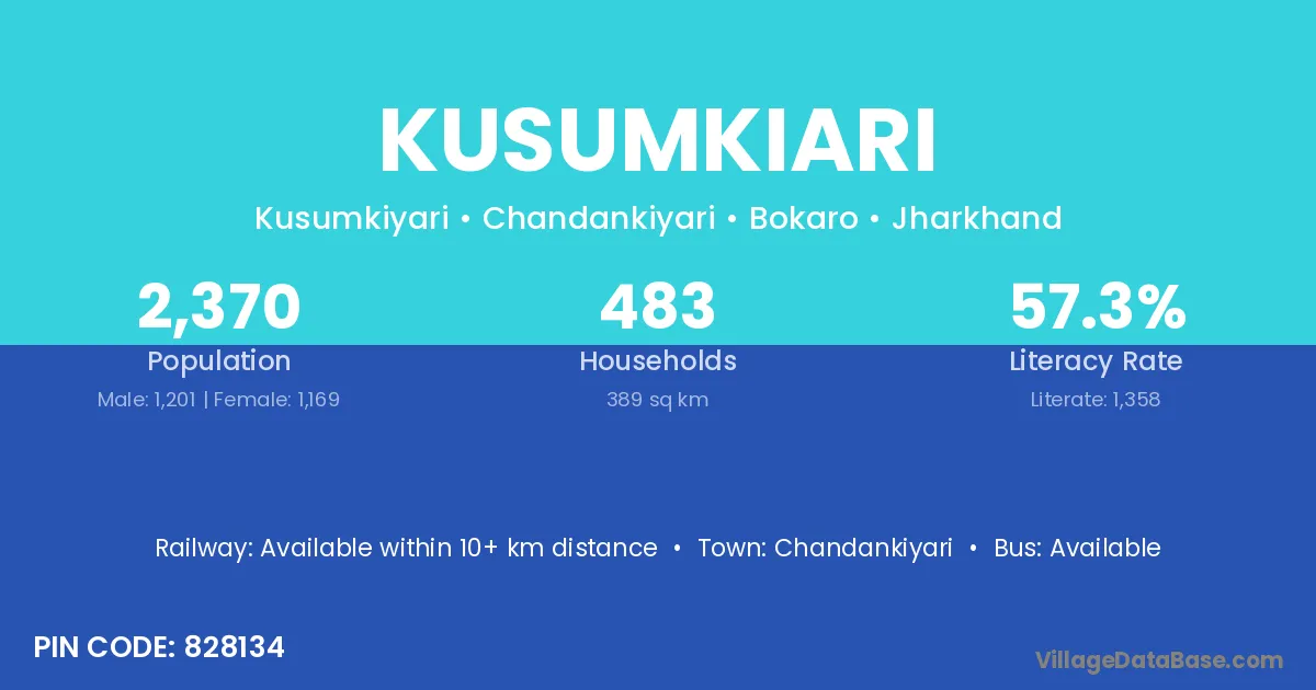 Kusumkiari village has a total population of 2,370 people, of which 1,201 are males and 1,169 are females.
