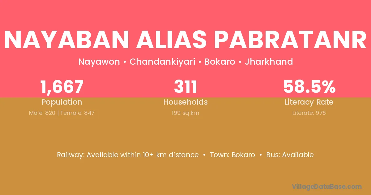 Nayaban Alias Pabratanr village has a total population of 1,667 people, of which 820 are males and 847 are females.