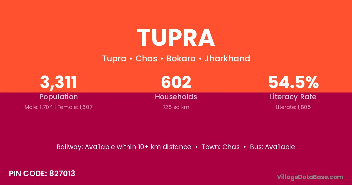 Tupra village has a total population of 3,311 people, of which 1,704 are males and 1,607 are females.