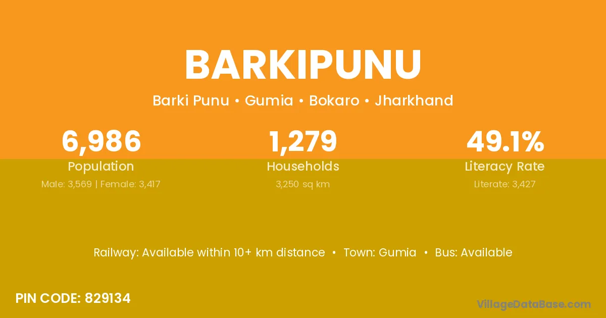 Barkipunu village has a total population of 6,986 people, of which 3,569 are males and 3,417 are females.