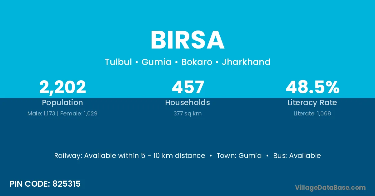 Birsa village has a total population of 2,202 people, of which 1,173 are males and 1,029 are females.