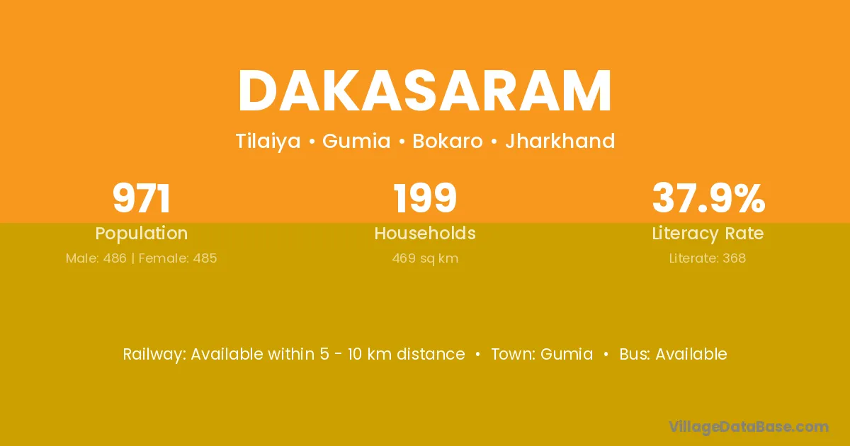 Dakasaram village has a total population of 971 people, of which 486 are males and 485 are females.