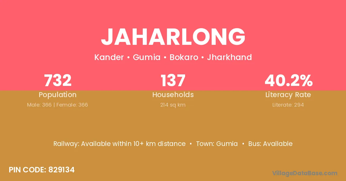 Jaharlong village has a total population of 732 people, of which 366 are males and 366 are females.