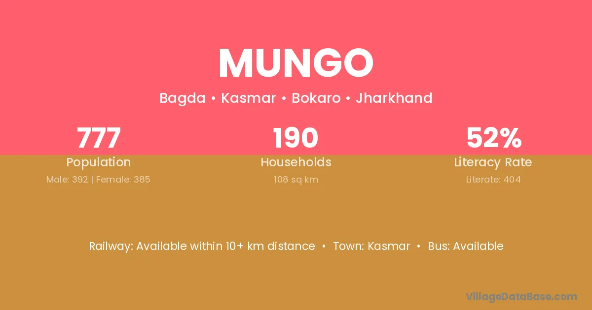 Mungo village has a total population of 777 people, of which 392 are males and 385 are females.