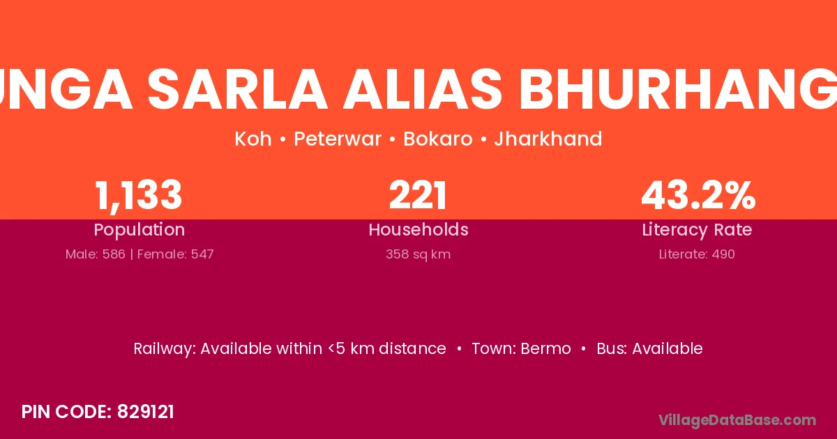 Munga Sarla Alias Bhurhangor village has a total population of 1,133 people, of which 586 are males and 547 are females.